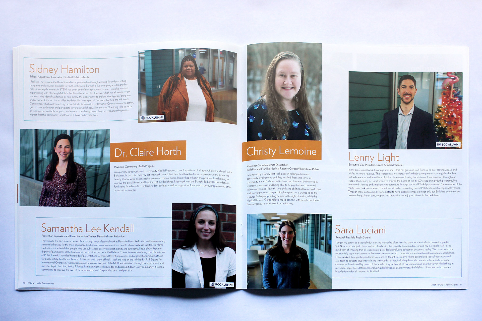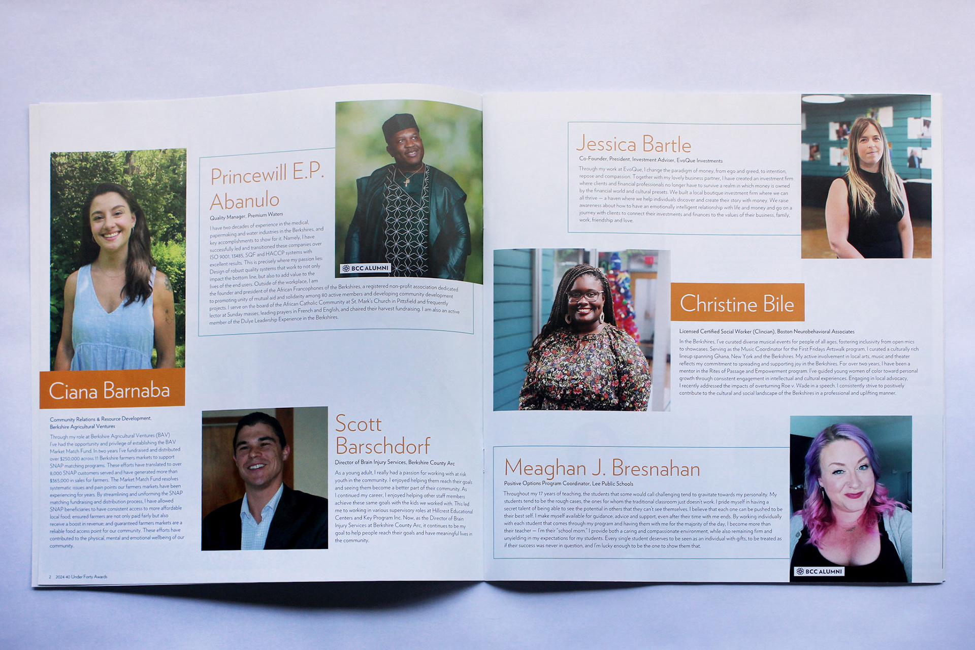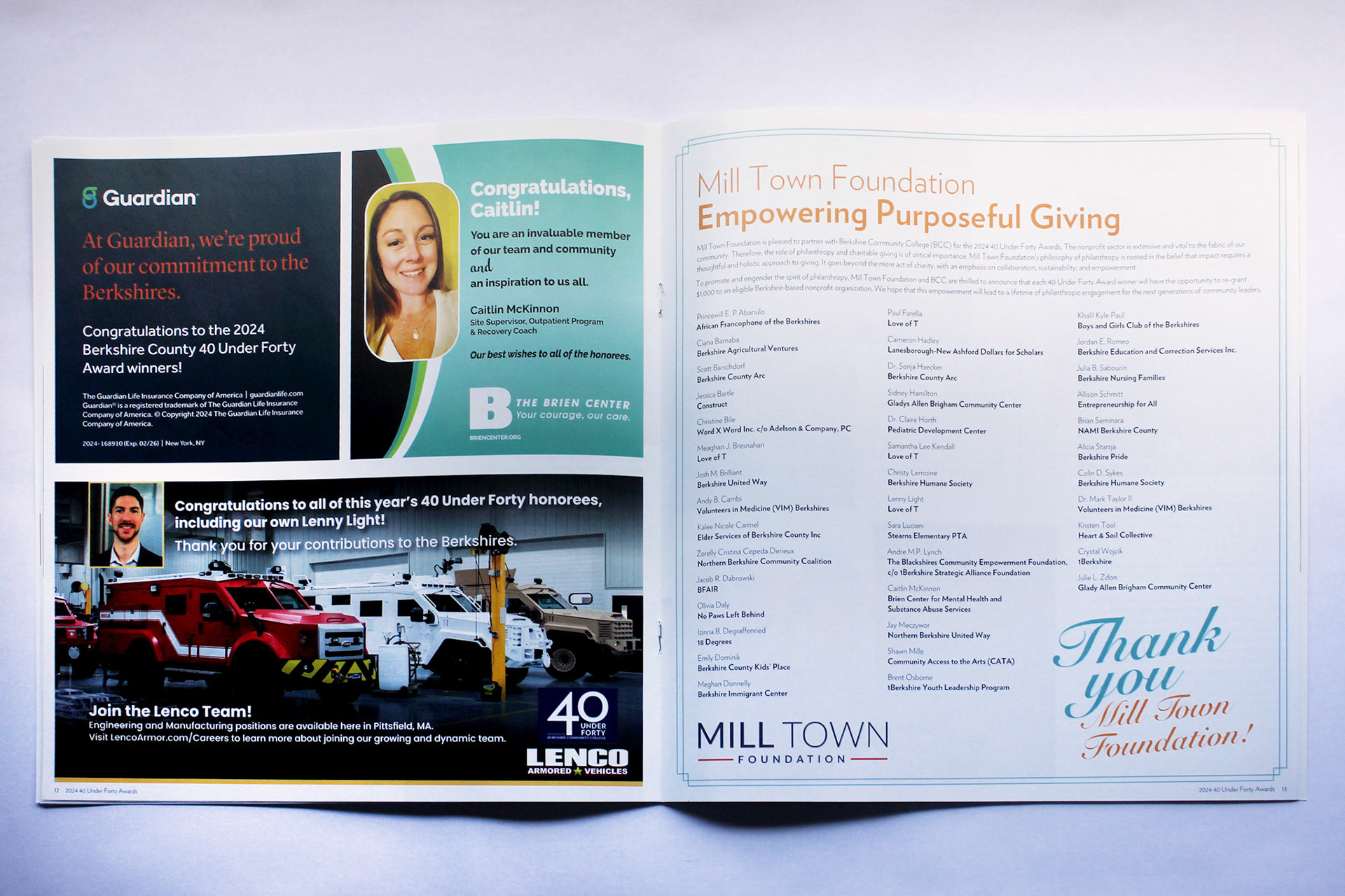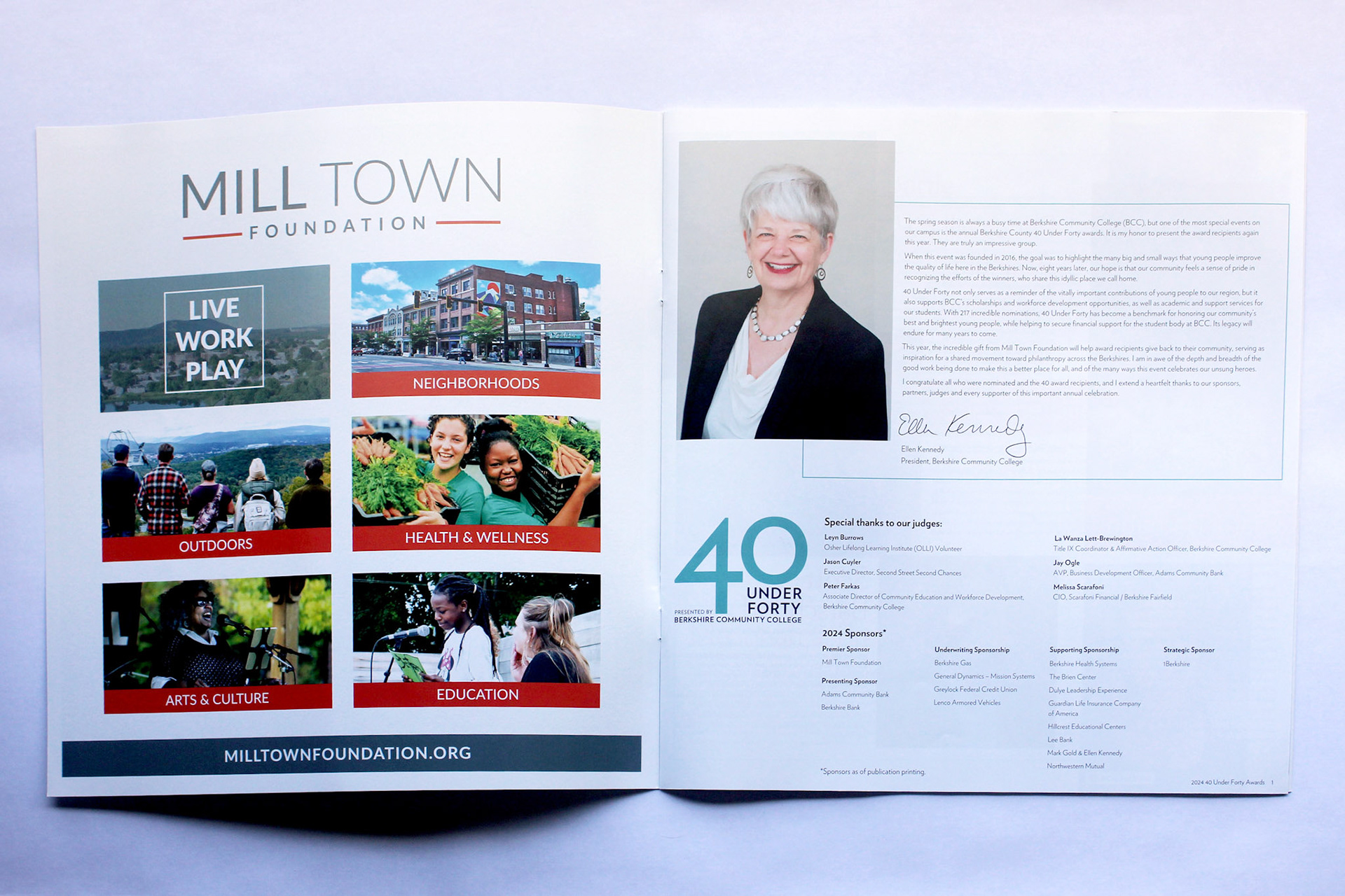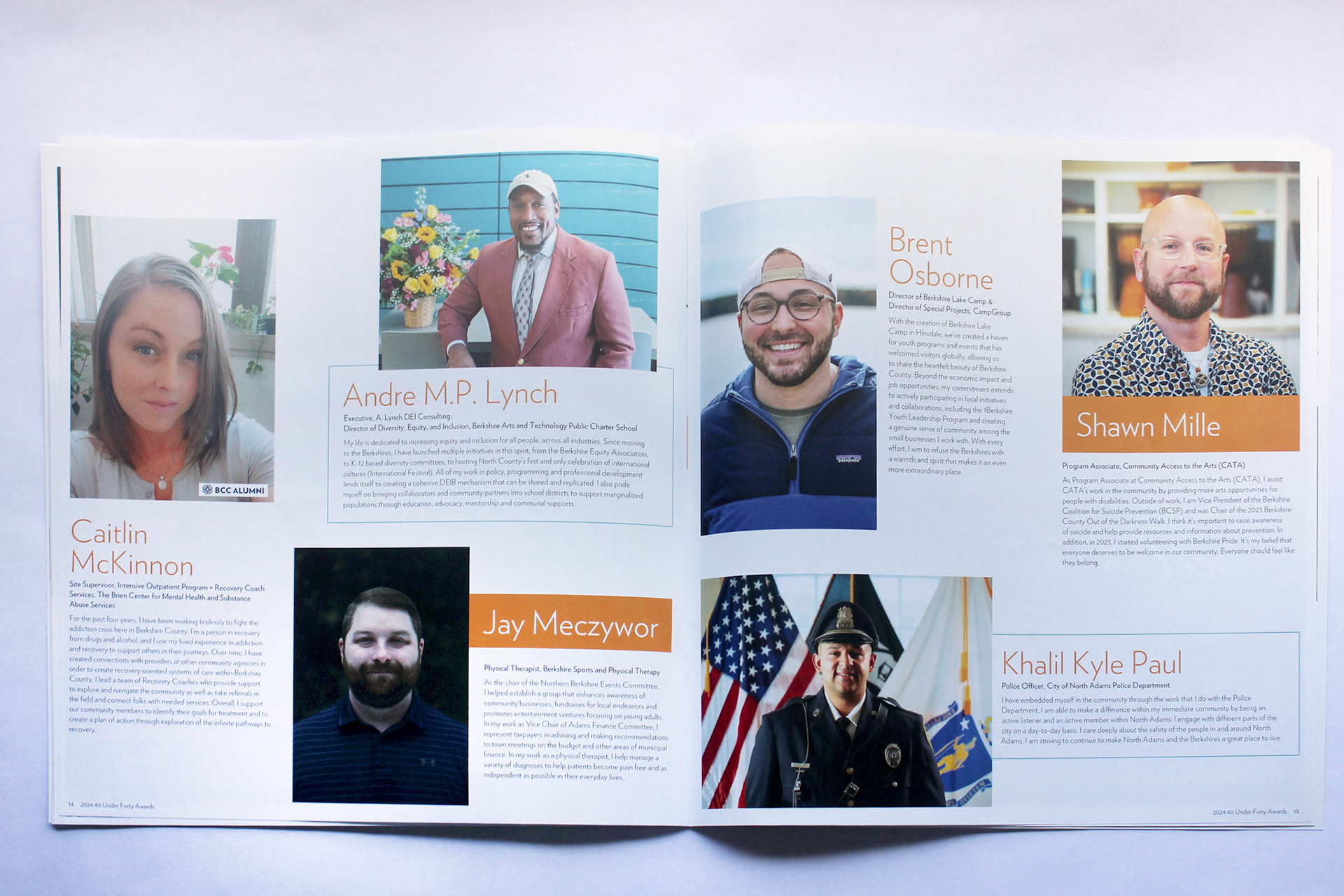 40 Under Forty is an annual celebration of talented people in the Berkshires, under the age of 40, who have a deep dedication to improving the quality of life for those living and working in the community. This project involved the design and production of a commemorative 40 Under Forty publication celebrating the 40 awardees. The publication functioned as both an editorial feature and the official program for the annual awards event. The primary challenge was creating a publication that highlighted 40 distinct individuals without becoming repetitive.