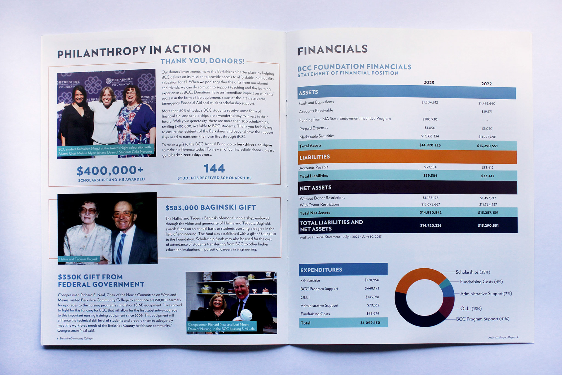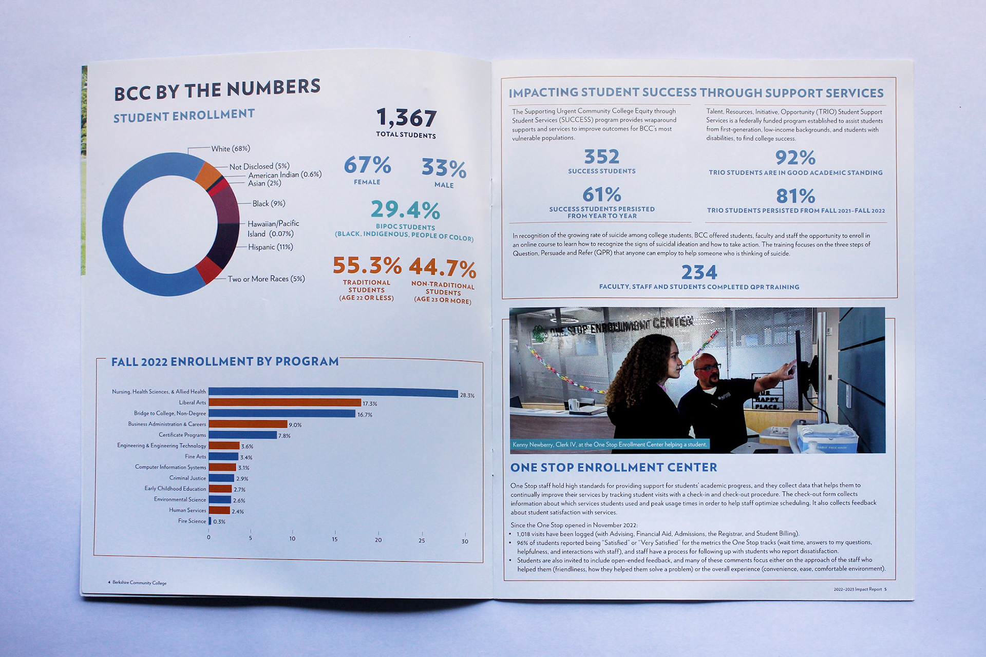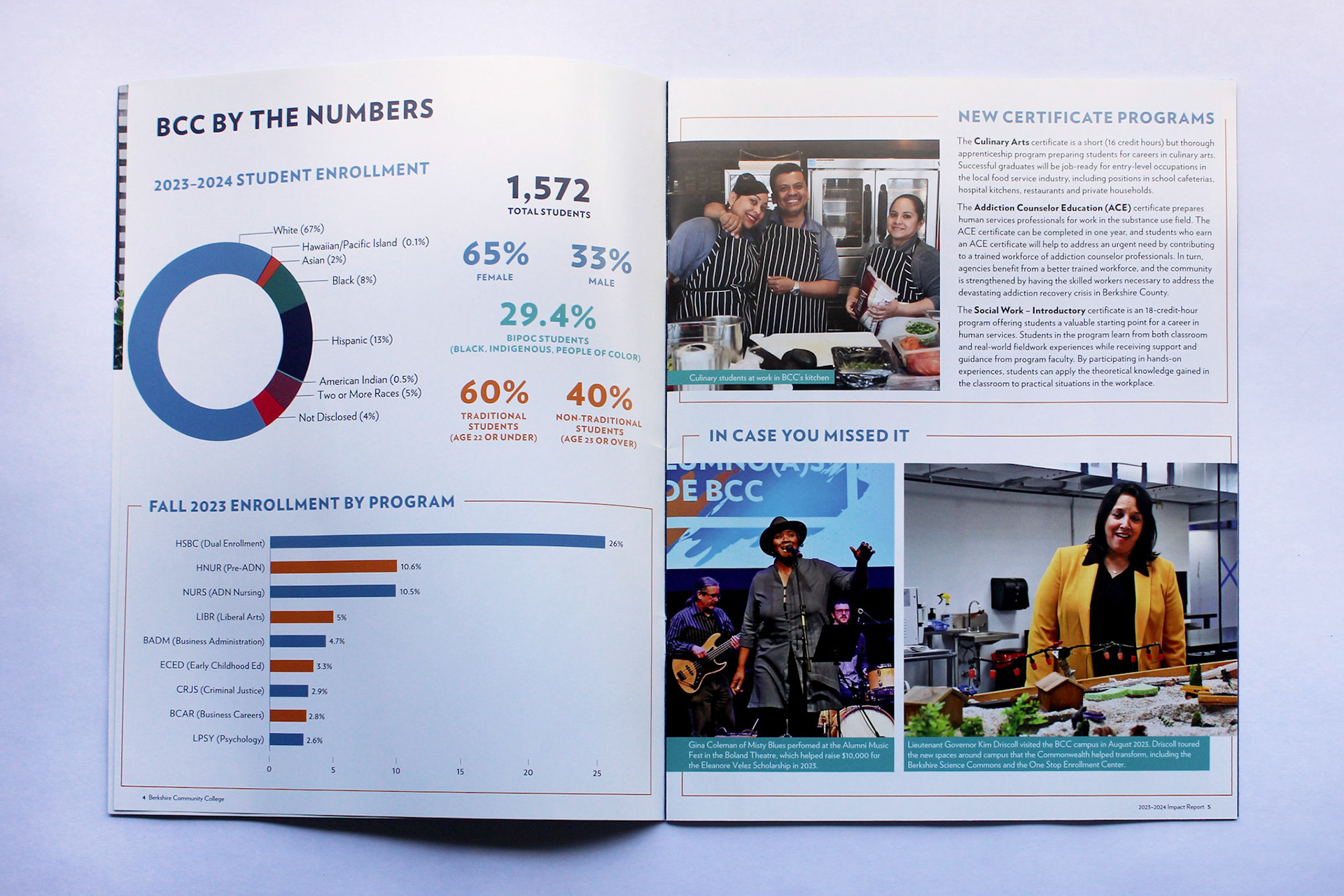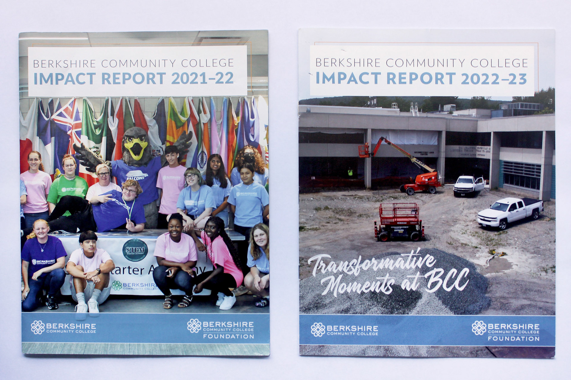 This project involved the complete visual design, layout, and photography selection for an annual impact report for Berkshire Community College (BCC). The goal was to translate complex data, community stories, and measurable outcomes into a compelling, accessible publication that reflects BCC’s high-quality values while engaging donors, employees, and community members. I developed a clean, modular layout system with custom infographics that could be adapted with each year's new content.